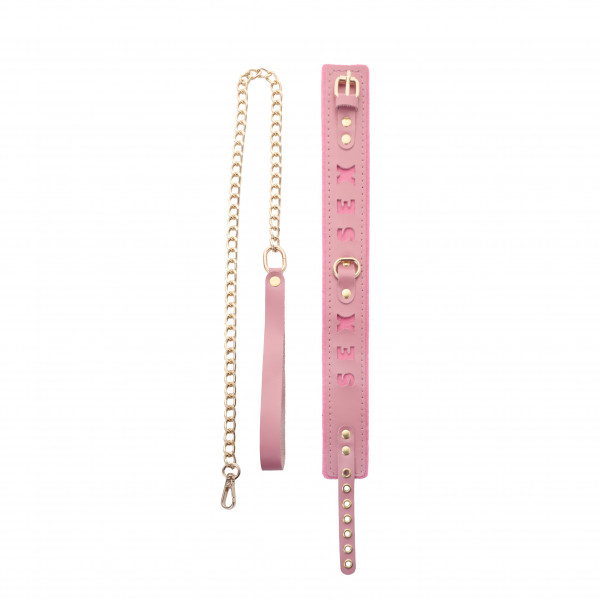 Ошейник с надписью SEX + поводок "Crazy Handmade" розовый, кожа