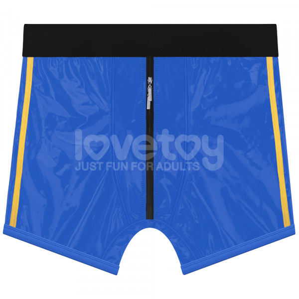 Трусики выполнены в синем цвете с желтыми полосками по бокам из винила. Провокационный блеск винила придает особенную пикантность образу! Молния спереди создает завесу тайны и скрывает истинное предназначение трусиков. Под молнией скрывается кольцо, к которому крепятся любые фаллоимитаторы и вибраторы.  Плотное кольцо гарантирует идеальную фиксацию фаллоса